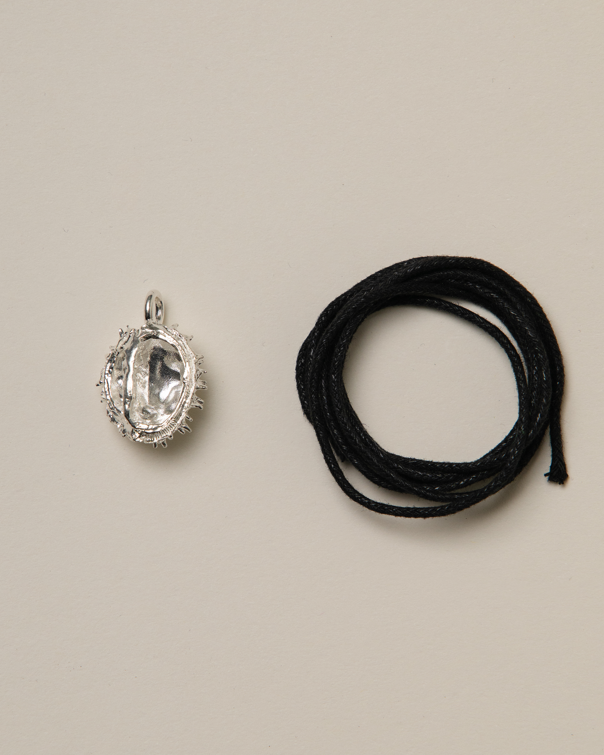 Choose your preferred chain to complement the charm: a minimalist waxed cotton cord, a leather cord, or a refined solid silver chain.